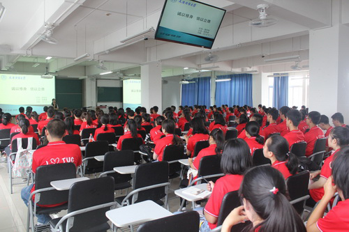 程青青博士以“诚以修身,信以立德”为题,从学术诚信、考试诚信、贷款诚信等方面入手,引用大量的案例,教育引导新生要把握底线,做诚信大学生。在讲座过程中,程青青还结合2018年学生工作手册,仔细为学生讲解了我校学生诚信档案管理办法,并在讲座中与学生积极互动,强化诚信教育的重要性。最后在程青青的倡议下,全体新生签署《天津商业大学学生诚信承诺书》。