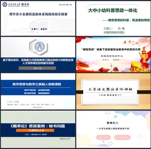 统计系徐立和滕树军、数学系张连娣、物理系刘敏和曹彦鹏、中文教研室孔庆庆、学工办程翠平7位老师分别以《基于理论知识、实践能力与思政教育三融合的统计创新型应用人才培养模式的构建与实践》《概率论思政案例:“秘书问题解读》《数学思想与数学之美融入高数课程—高等数学课程思政建设探讨》《大中小幼科普思政一体化—做有思想的科普,有温度的思政》《“课程思政”视角下实验室安全教育中的思政元素》《大学语文思政案例:论语•雍也篇第六讲解》《青春向上—大学生积极心理品质培养计划》为主题,就如何结合专业与课程特点,立足本职岗位做好课程思政规划、挖掘课程思政元素、编写课程思政案例等方面进行了汇报与交流。