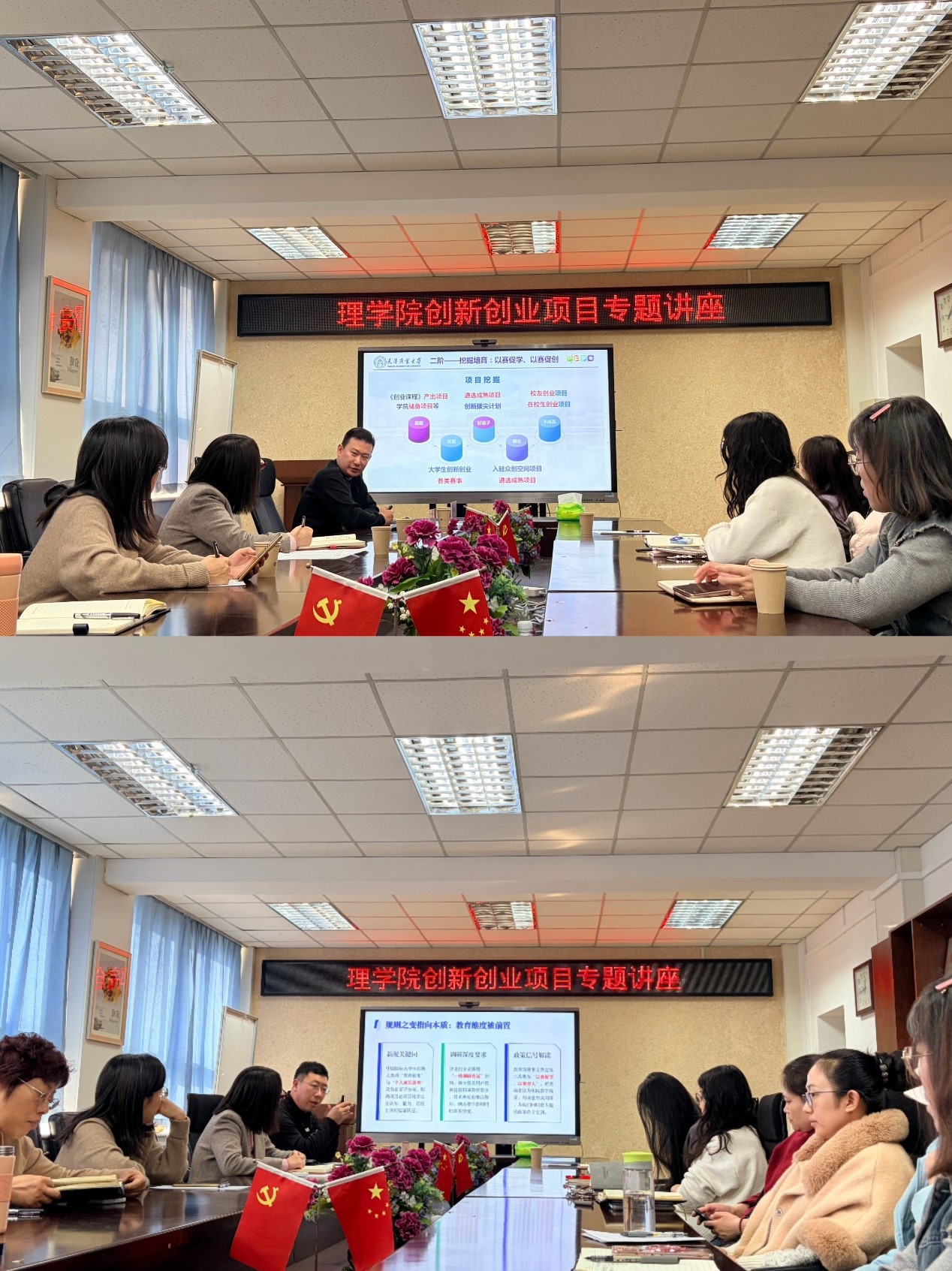 1月15日下午,理学院在1号教学楼806会议室举办创新创业项目专题培训会。会议特邀学校党委学工部(学生处、大学生创业中心)副部长(副处长、副主任)冯延超、信息工程学院教师李立鹏担任主讲嘉宾。学院领导班子成员、创新创业团队教师及部分青年教师参会。
