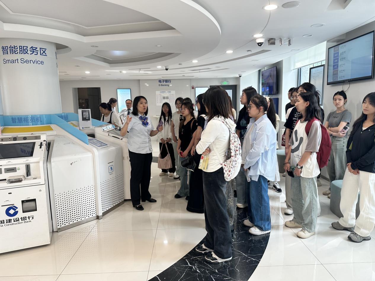 在营业大厅参观环节,孙国华以建行发展史为切入点,向师生们介绍了中国建设银行从成立至今的服务宗旨与战略转型。“作为国有大型商业银行,建行始终以服务国家建设、赋能实体经济为己任。”他结合红桥支行的区域特色,详细讲解了普惠金融、绿色信贷、数字化转型等业务板块,帮助同学们理解金融行业的社会价值。张若楠现场演示了智能柜员机、移动金融服务终端等设备的操作流程,并科普了反诈防骗、理财规划等实用知识。“金融不仅是数字的游戏,更是与人民生活息息相关的工具。”她鼓励同学们夯实专业基础,同时拓展跨学科视野。